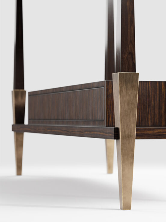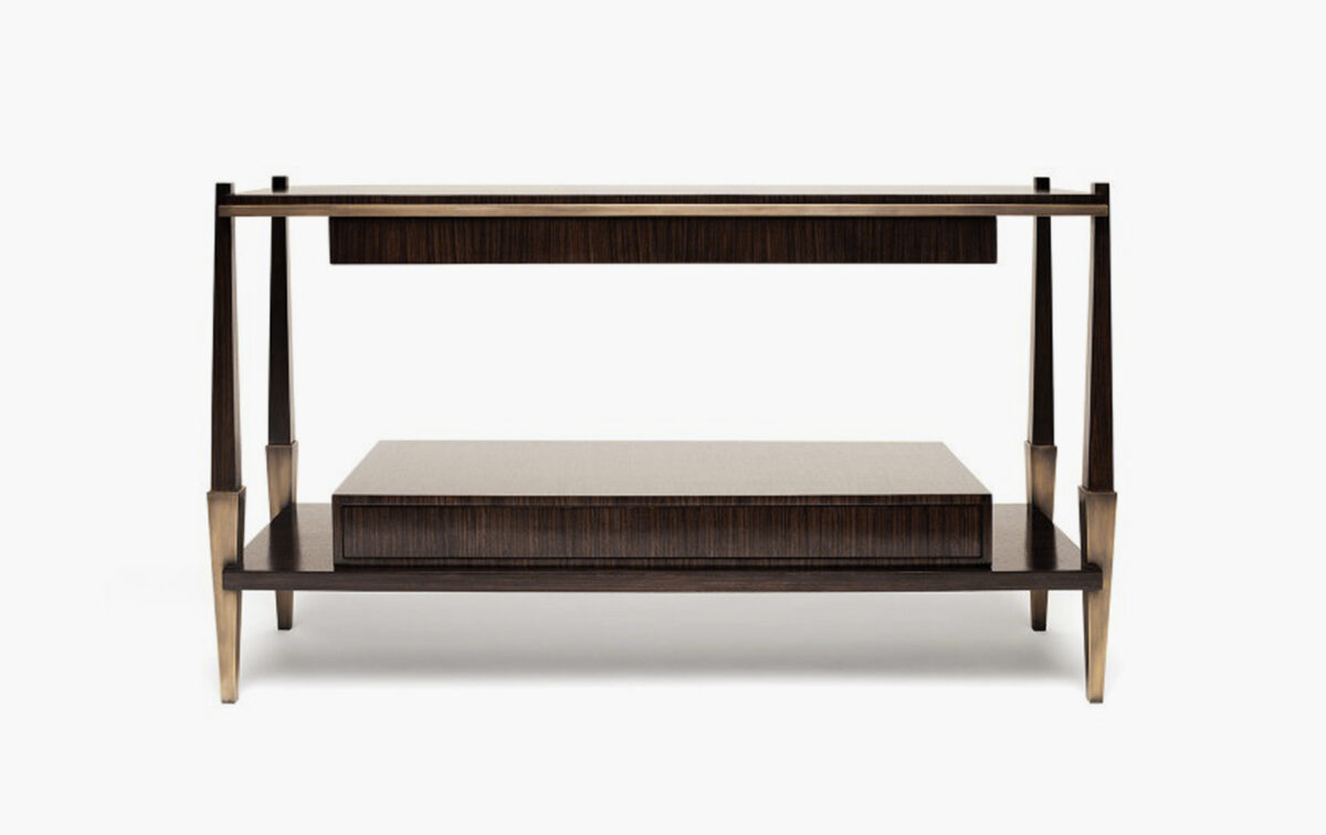 Shown in a bespoke wood finish of high gloss dark zebrano and linished brass.